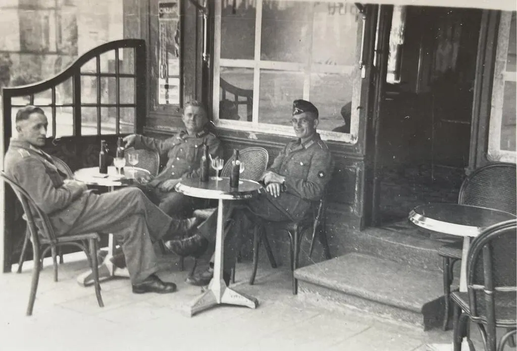 Des soldats allemands prenant un verre à la terrasse du café de la Paix. À l’arrière-plan, à gauche, on distingue les murs du château (le tribunal) qui abritait alors la prison d’Argentan. © Collection François Boscher