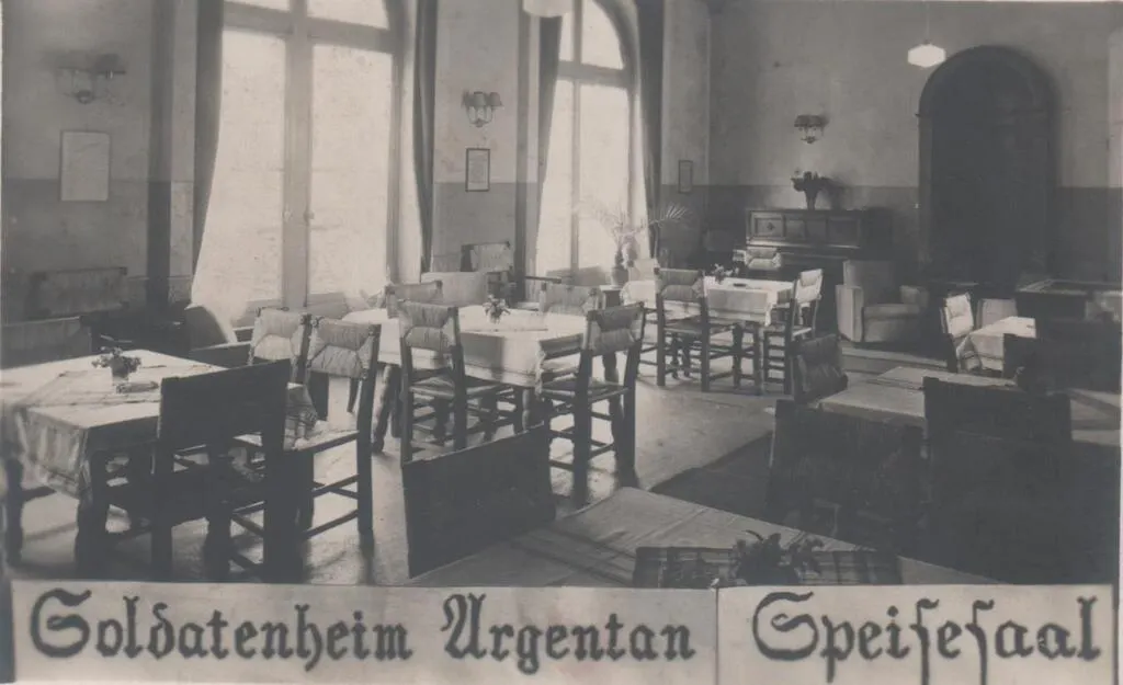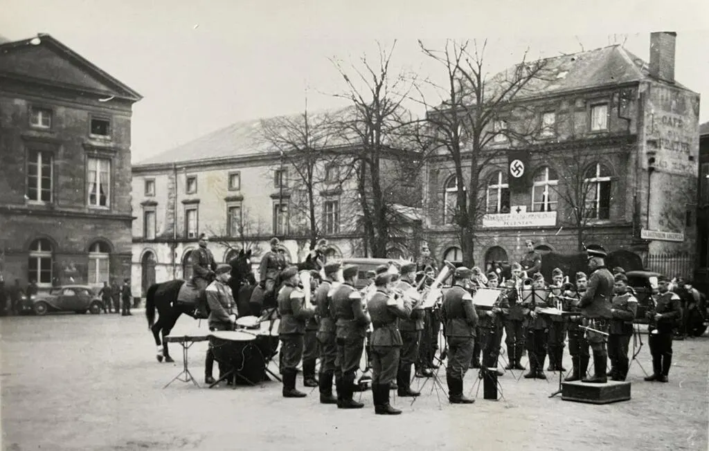 À Argentan, le Foyer du Soldat ou Soldatenheim (à droite) devant lequel joue une fanfare allemande, place de l’hôtel de ville. À gauche, la mairie. © Collection François Boscher