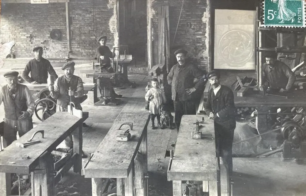 Étienne Panthou (au centre, ici dans les années 1910) dirigeait une entreprise de menuiserie, route d’Écouché à Argentan (Orne). © Collection François Boscher