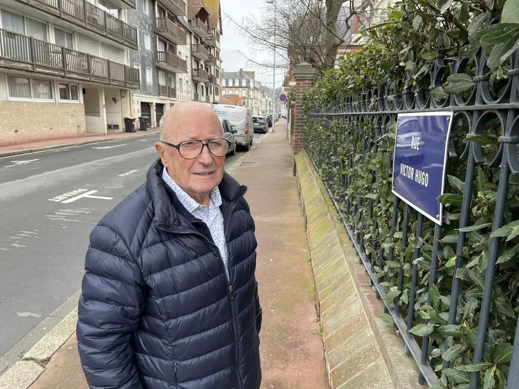 Pierre Santos devant la plaque commémorative, installée rue Hoche, à Deauville, en mémoire des cinq victimes deauvillaises tuées le 22 août 1944. Alors âgé de 12 ans, il jouait à une centaine de mètres du lieu de l’explosion. © Ouest-France