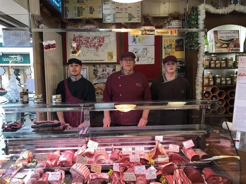 Dominique Tulane, boucher-charcutier-traiteur à Argentan (Orne), entouré de ses salariés Rémi et Mathéo. © Ouest-France
