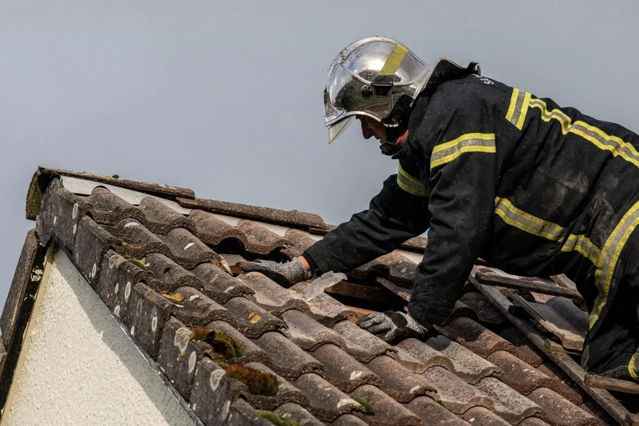 Des pompiers interviennent chez des habitants de Reigneville-Bocage (Manche) pour remplacer des tuiles cassées par la tempête Goretti sur une toiture. © Martin ROCHE / Ouest-France