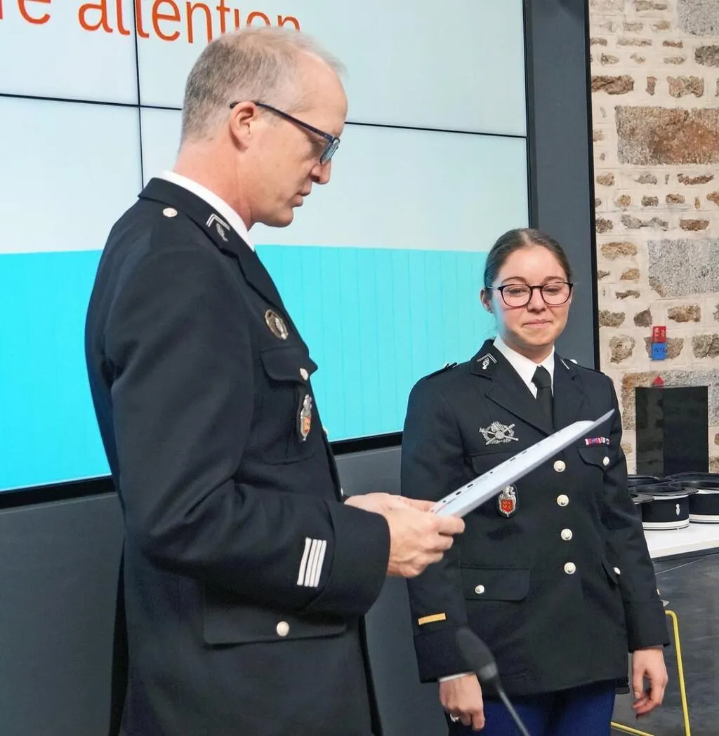 L’adjudante Aude Letouzey reçoit la lettre de félicitation des mains du chef d’escadron Romain Soulary. © Ouest-France