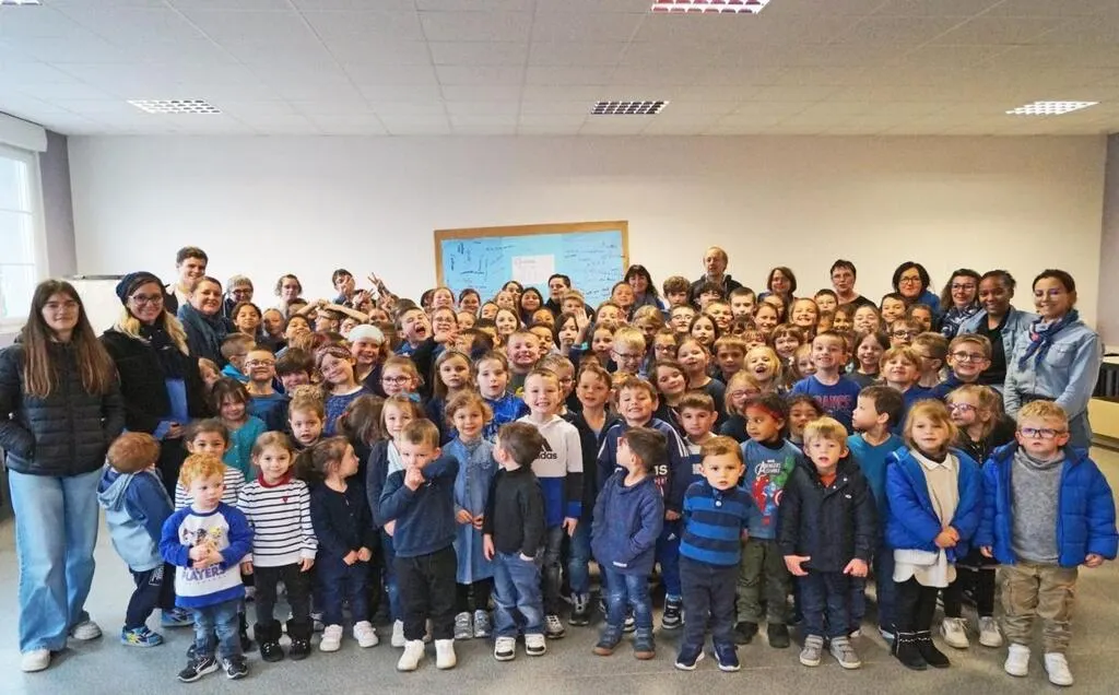 Enfants, équipe éducative et parents, tous étaient habillés de bleu pour la journée. © Ouest-France