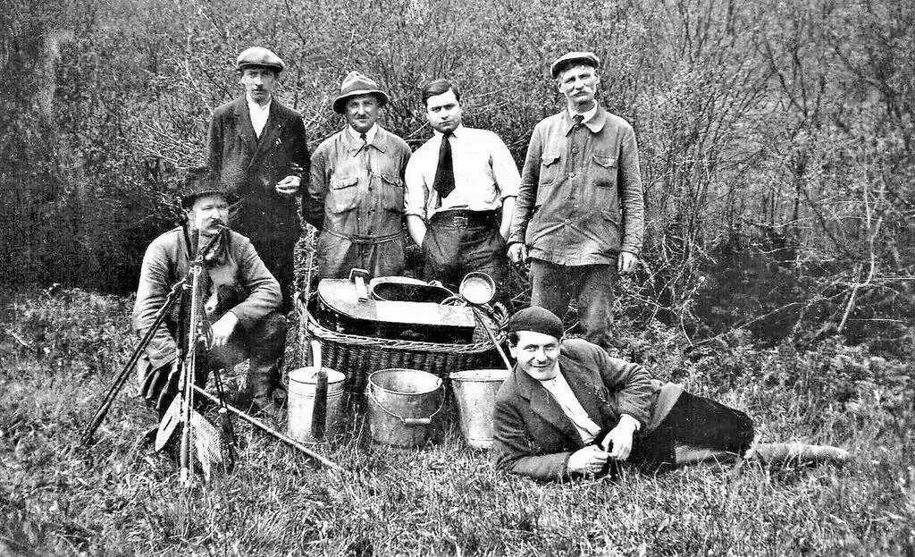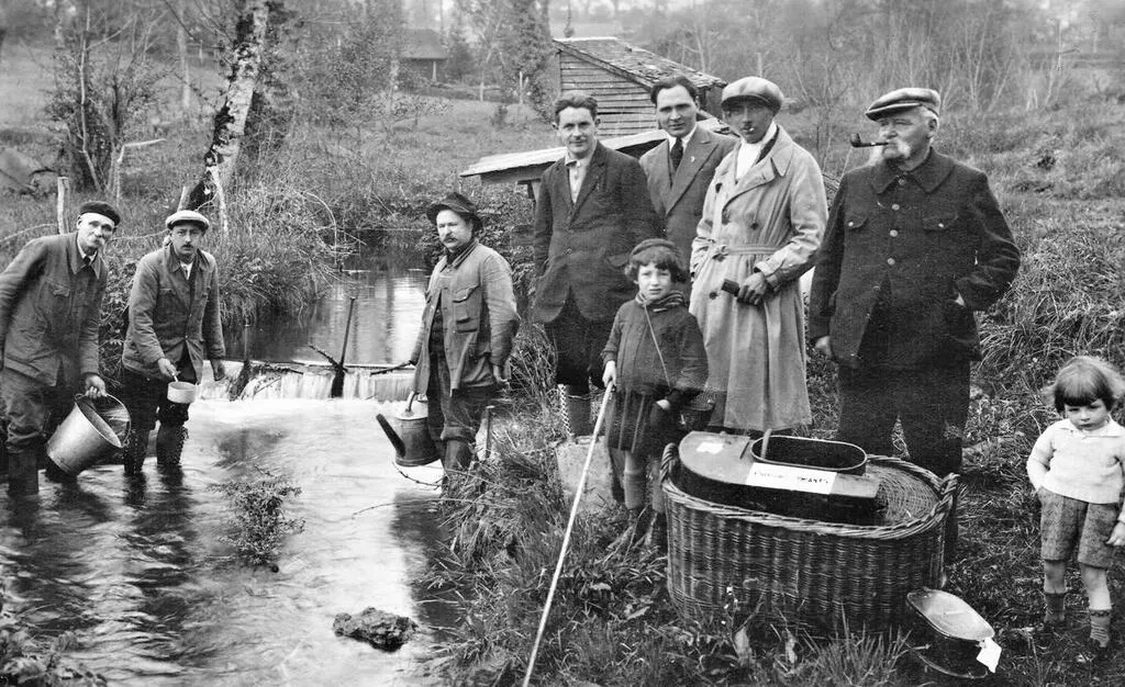 Au cours d’un alevinage, dans les années 1930, avec le bac dans le panier en osier au centre de la photo. Les cannes disposées en faisceau sont aussi de la partie. © Gaule Tinchebrayenne
