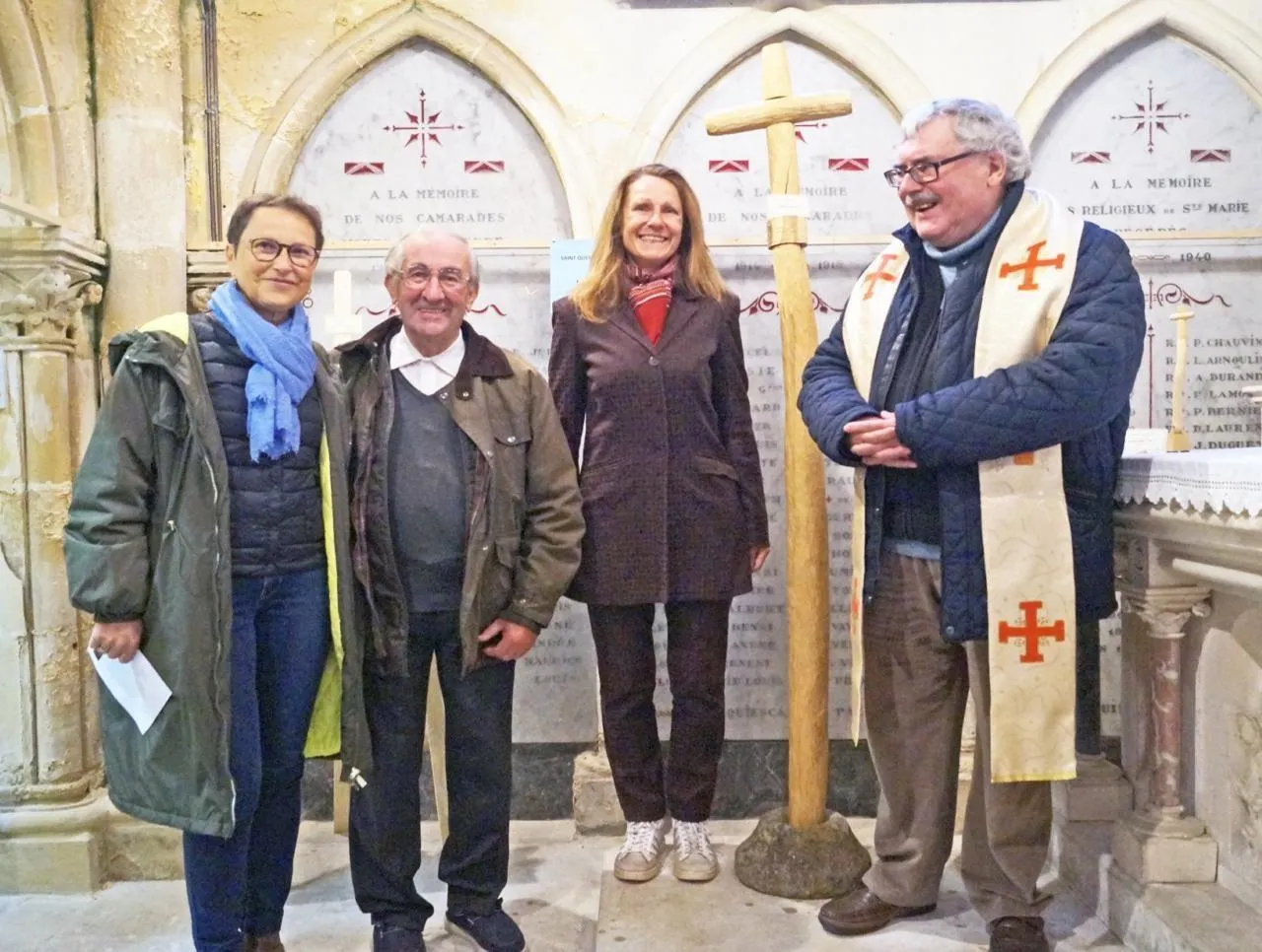 Annie Mauduit, la présidente des Amis de la chapelle Sainte-Marie ; Dominique Deveaux, l’initiateur de l’exposition de peinture et calvaires ; Cécile de Banville, l’artiste qui a magnifié le buis, et le père Raymond Hébert, qui a béni la croix au cours d’une cérémonie empreinte de solennité. © Ouest-France