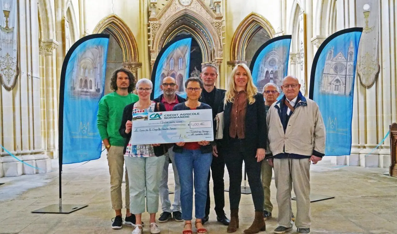 Au premier rang, Catherine Julienne, présidente du conseil d’administration du Crédit agricole ; Annie Mauduit, présidente des Amis de la chapelle Sainte-Marie ; Isabelle Froment, directrice de l’agence locale, et des membres de l’association. © Ouest-France