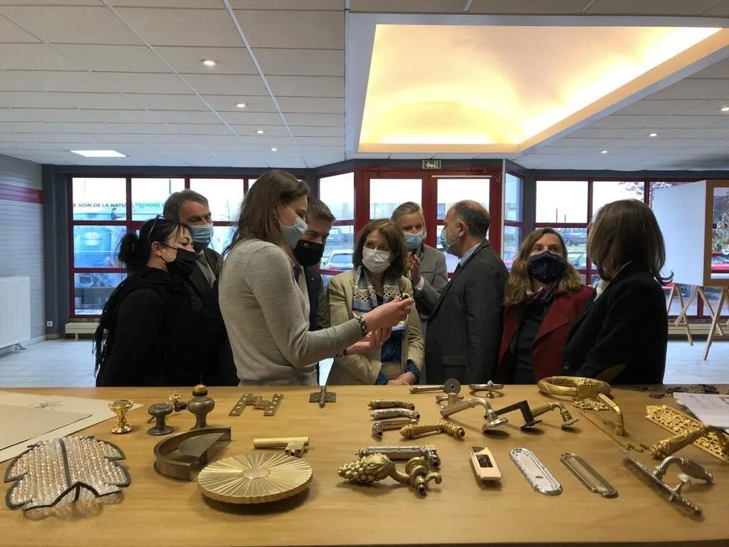 Au centre, Émilie Morvan, PDG de l’entreprise Baguès-Bronzes de France à Tinchebray-Bocage montre une poignée de porte en bronze à Françoise Tahéri, préfète de l’Orne. Ouest-France