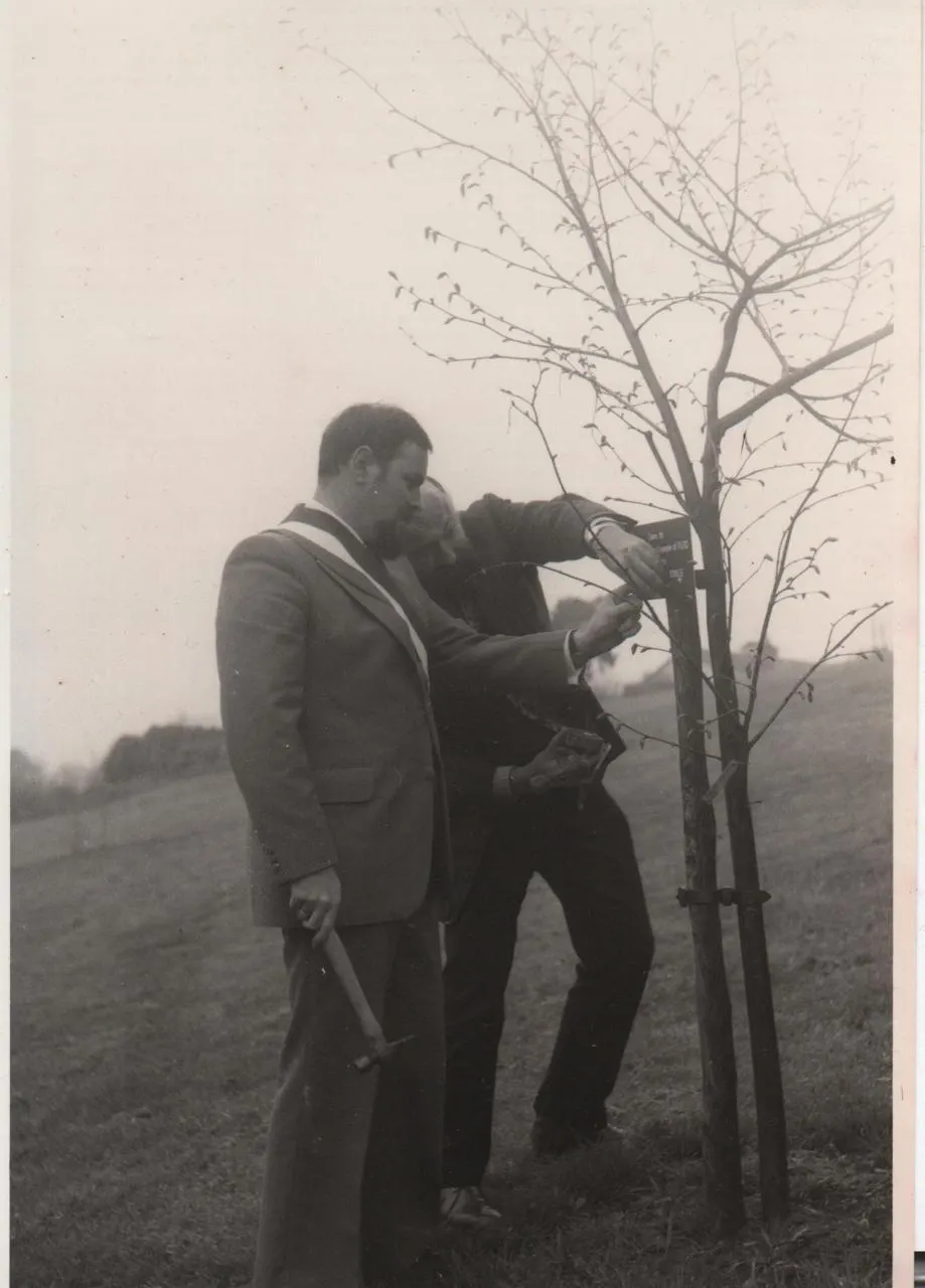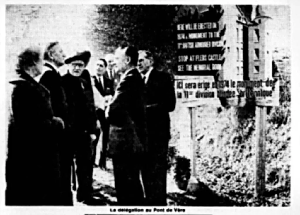 La délégation de Warminster en mars 1972, sur le site du futur mémorial en hommage aux morts de la 11e DBB. © Archives Ouest-France