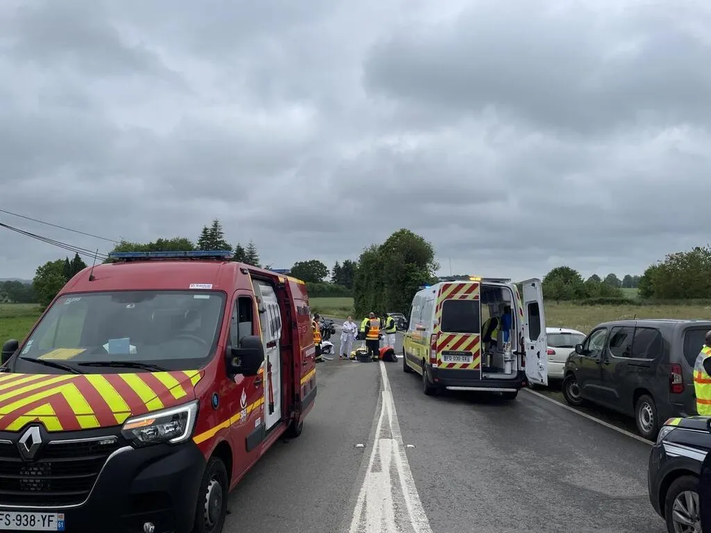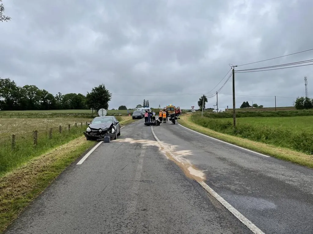 Une collision entre une voiture et une moto a fait un blessé sur la RD43 entre Landigou et Messei, près de Flers (Orne), samedi 1er juin 2024.