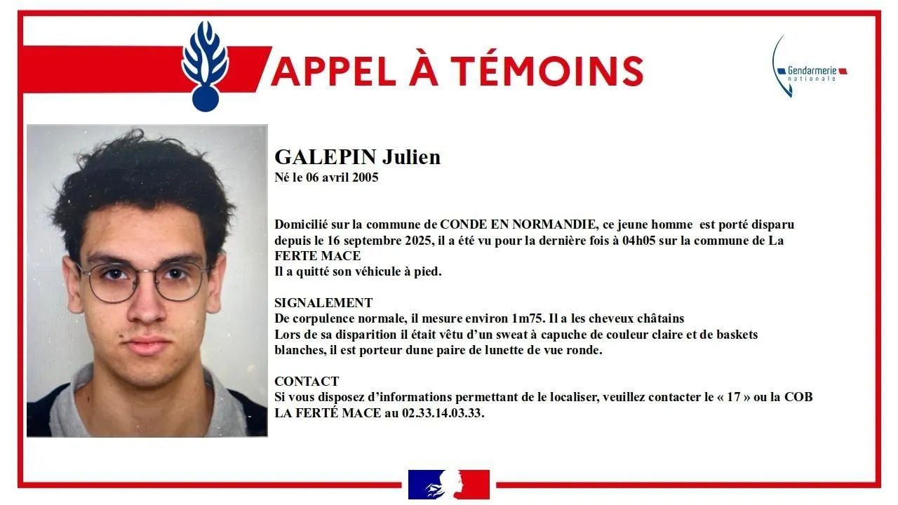Un appel à témoin, pour retrouver un homme, a été lancé mardi 16 septembre 2025 par la gendarmerie de Domfront-en-Poiraie dans le cadre d’une enquête pour « disparition inquiétante ». Selon le capitaine Jean-François Bruneau, Julien Galpin, 20 ans, « a disparu depuis le 16 septembre 2025 et a été vu pour la dernière fois à 4 h 05 dans la ...
