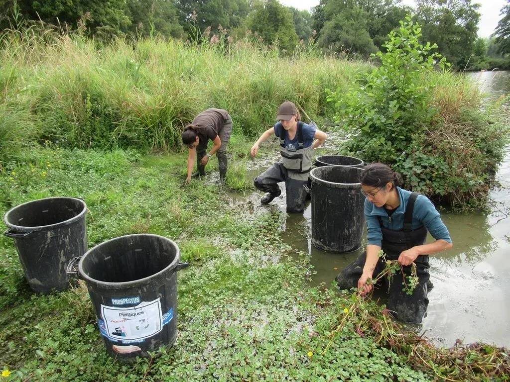 Chantier d’arrachage de jussie rampante pour stopper l’évolution de cette plante envahissante. © Valentin Vautrain, Parc naturel régional du Perche