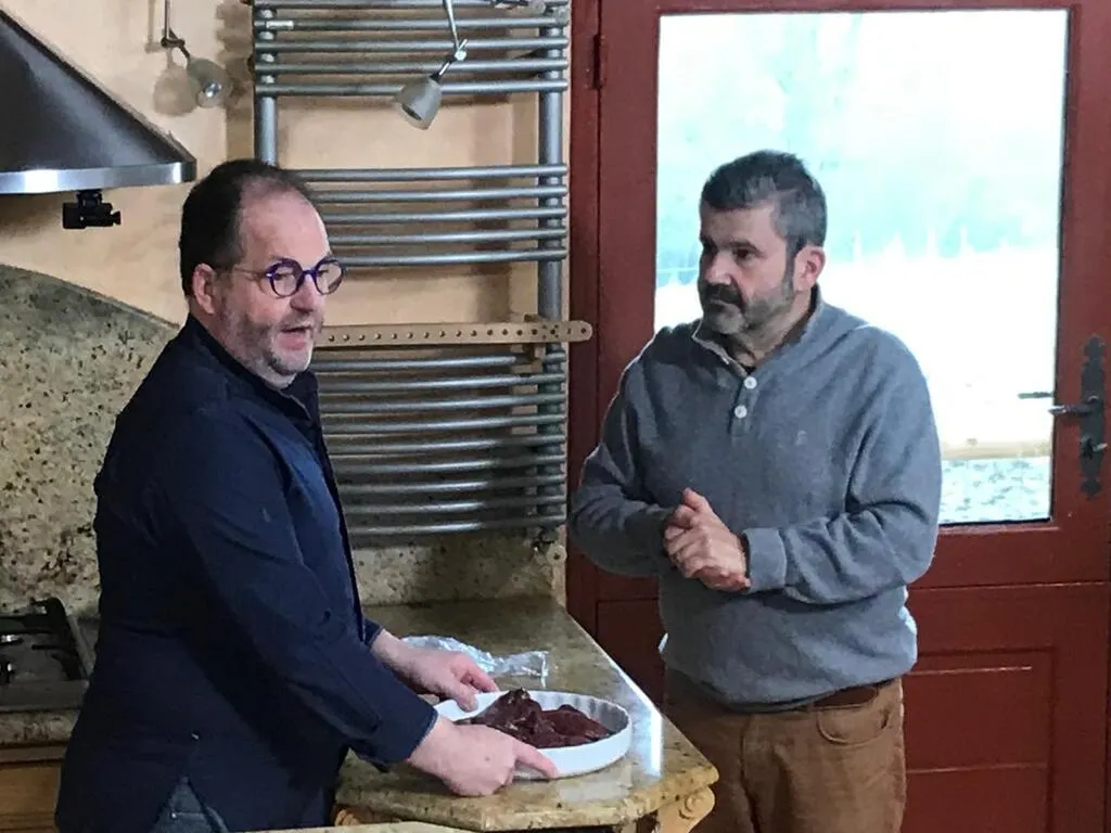 Sylvain Guillemot, à gauche, accueilli par Philippe Andrès, dans sa cuisine à Bures. Ensemble © Ouest-France