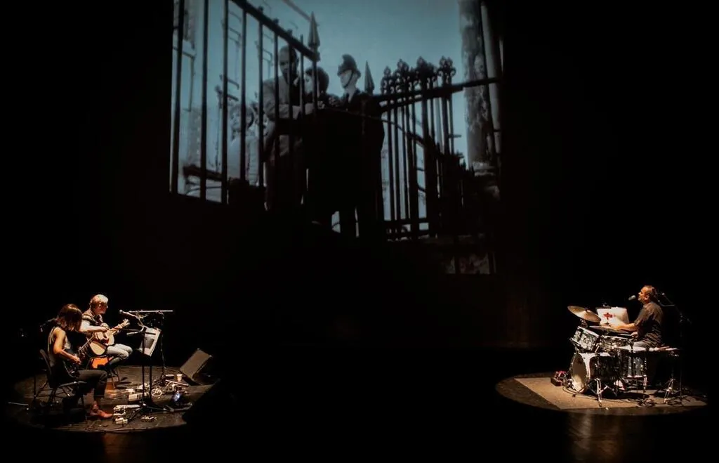 Ariane Monteverdit est chanteuse, guitariste et compositrice. Elle tourne en solo, mais aussi dans de nombreux autres projets folk, pop. Stéphane Louvain est guitariste, chanteur, compositeur, engagé dans des projets personnels et a également joué avec Les little rabbits, Jeanne Cheral, Philippe Katerine… Moi, je suis saxophoniste et pour ce ciné-concert, je joue de la batterie. Je suis aussi leader de plusieurs projets, Francis et ses peintres, Happymood… et j’ai monté de nombreux ciné-concerts.