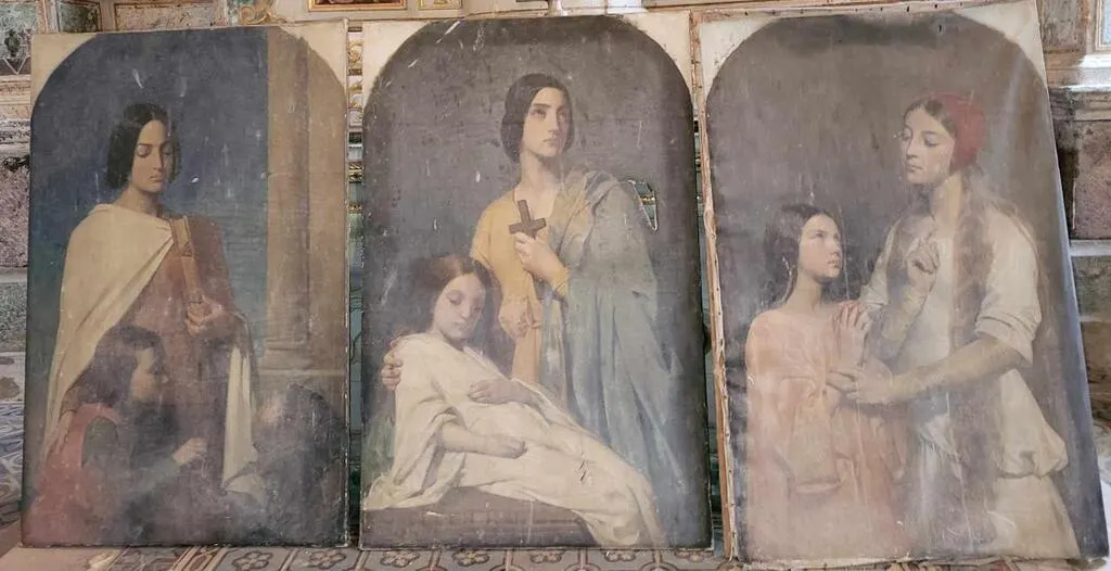 Les tableaux représentant les trois vertus théologales : La Foi, La Vertu et l’Espérance, qui vont bénéficier des dons, étaient jusqu’à présent remisés dans la sacristie, le mur sur lequel ils étaient apposés étant en trop mauvais état.