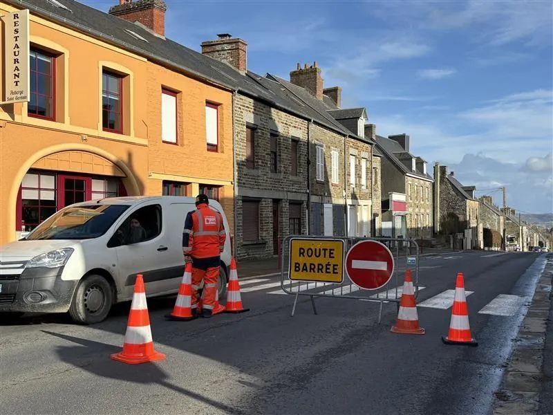 Impossible pour les automobilistes de se rendre à Condé-en-Normandie. Les axes sont bloqués, comme ici, dans le village de Saint-Germain-du-Crioult (Calvados), ce vendredi 6 février 2026. © Ouest-France