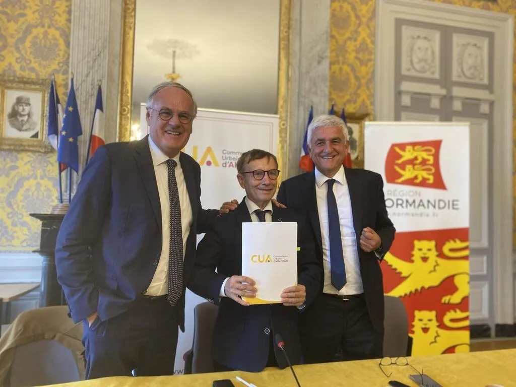 Christophe de Balorre, président du conseil départemental de l’Orne ; Joaquim Pueyo, président de la CUA et maire d’Alençon, et Hervé Morin, président de la Région Normandie, ont signé un nouveau contrat de territoire ce mardi 8 octobre 2024. © Ouest-France