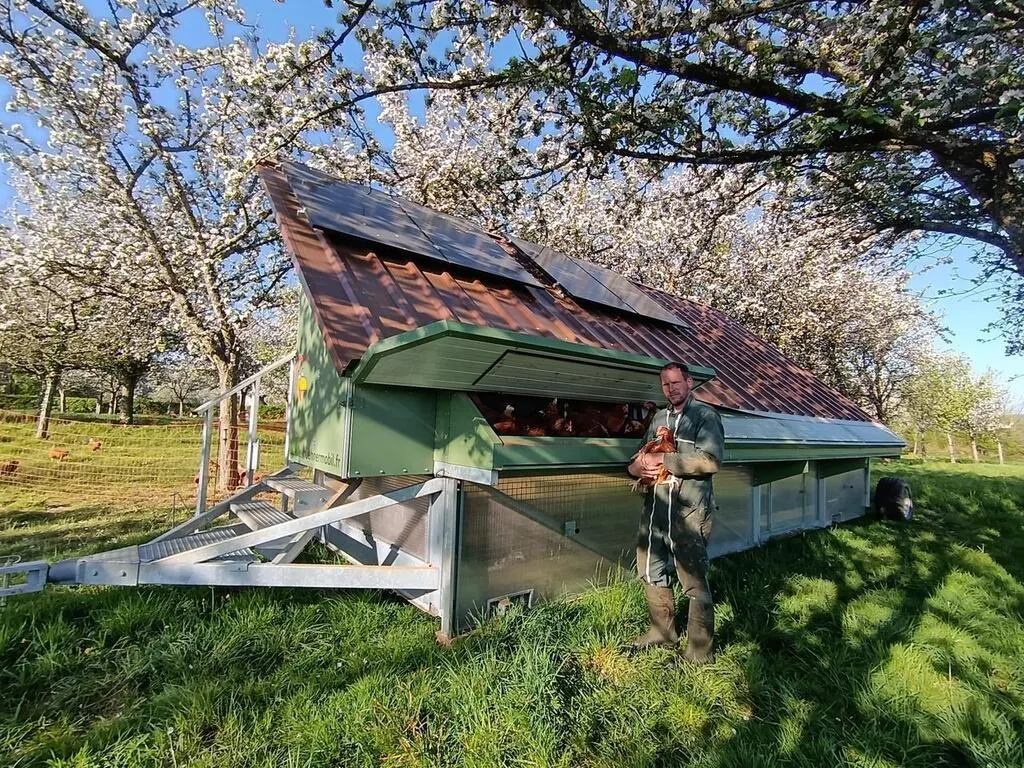 . Son poulailler mobile est équipé d’une horloge astrologique, qui suit le soleil matin et soir ; l’ouverture et la fermeture sont programmées automatiquement ; le poulailler s’allume le soir jusqu’à 22 h et le matin à partir de 6 h, puis j’arrive et je ramasse les œufs. Sur un terrain de 9000 m², il a divisé la parcelle en 8 lots pour faire un circuit et déplacer le poulailler régulièrement ; il s’écoule 2 mois avant que je ne remette le poulailler sur le même lot. Un vide sanitaire, en quelque sorte