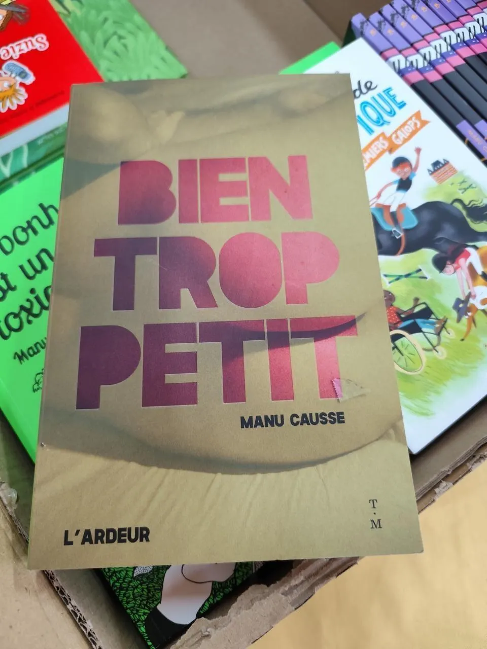 Le livre « Bien trop petit », de Manu Causse, était à disposition sur le stand de l’auteur au salon du livre jeunesse d’Essay, près d’Alençon, dans l’Orne, vendredi 21 et samedi 22 mars 2025, alors qu’un arrêté ministériel interdit qu’il soit proposé à des mineurs. La librairie organisatrice assume ce choix.