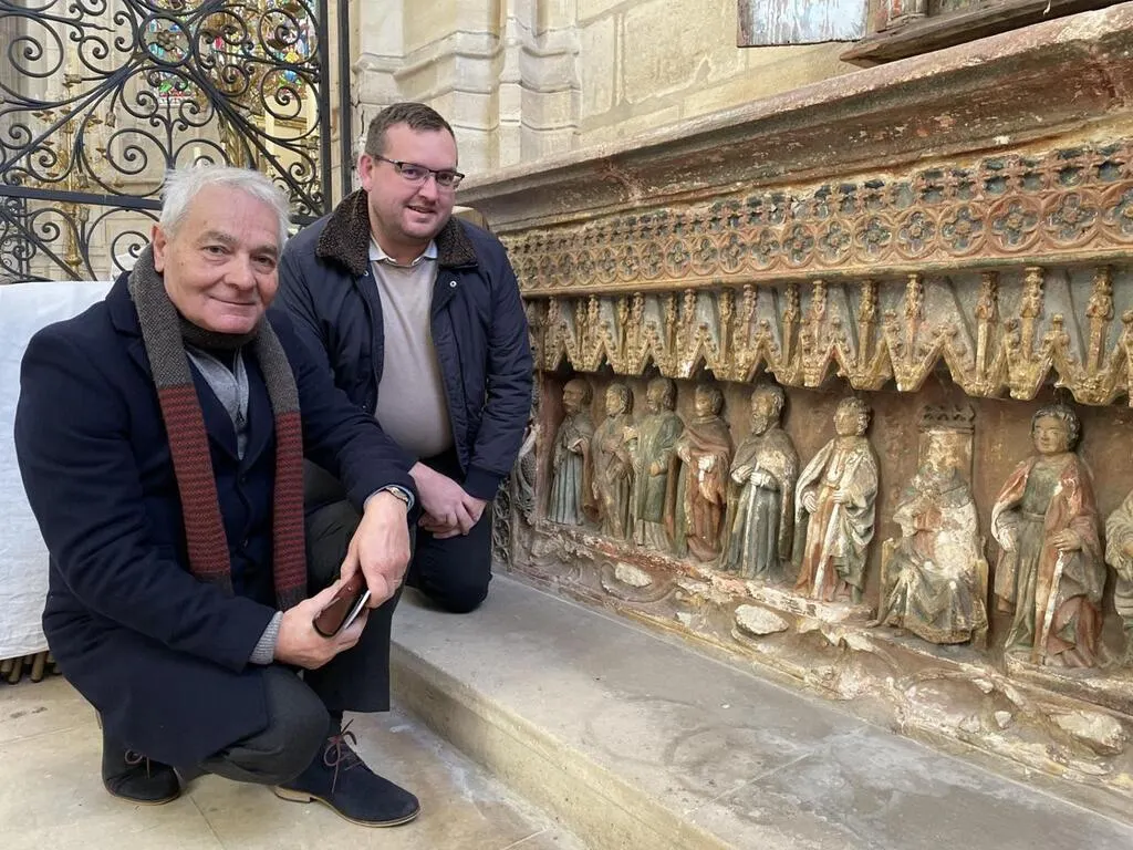 Fabien Pitois (à droite) et Pierre Tessier devant le bas-relief du XVIe siècle nécessitant une restauration. © Ouest-France