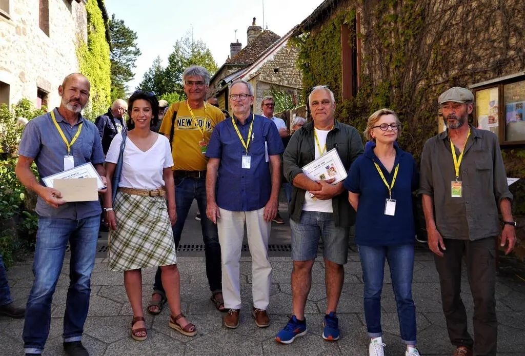 Le palmarès 2023, avec à gauche : Jean-Philippe Lagache, prix du public ; Gérard Cambon, prix du jury, avec leurs diplômes, entourés des bénévoles des Amis de Saint-Céneri et des partenaires donateurs. © Ouest-France