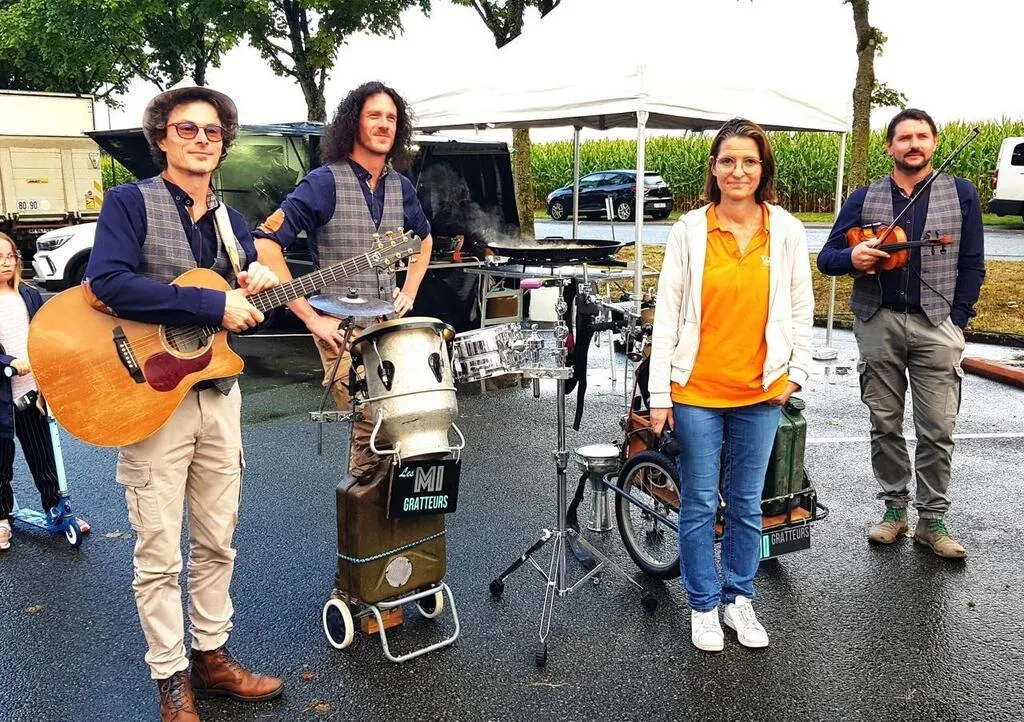 La première fête communale de la nouvelle présidente, Muriel Parpaillon, ici avec le groupe musical les Mi-Gratteurs, a été bien arrosée. © Ouest-France