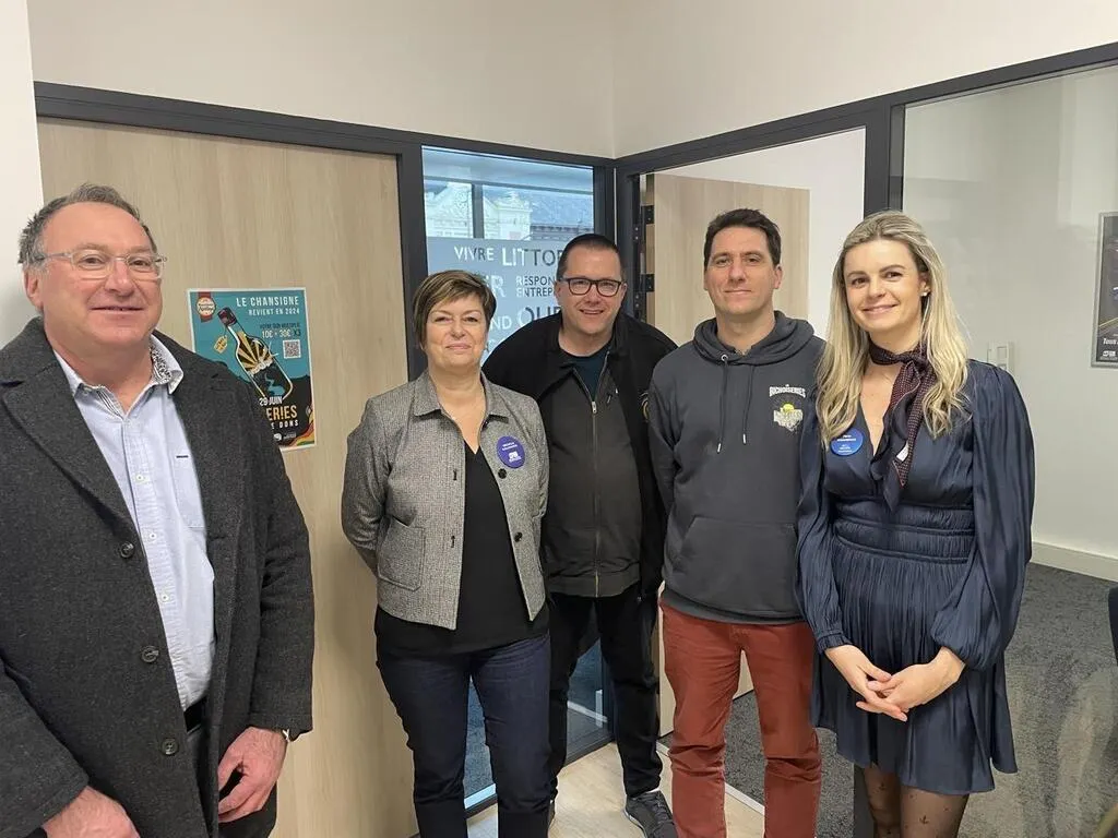 Marc Lebaudy, de la biscuiterie de l’Abbaye ; Véronique Guillet-Borde, directrice BPGO (Banque populaire grand ouest) groupe Orne ; Hervé Breton et Yannick Montembault des Bichoiseries, et Flavie Champain, directrice de l’agence de Flers de la Banque populaire. © Ouest-France