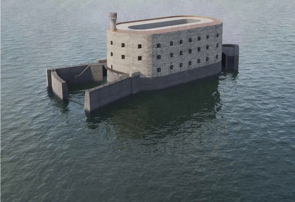 Une modélisation 3D des futurs ouvrages de protection du Fort Boyard, en Charente-Maritime. L’édifice, fragilisé par la houle, fait l’objet d’une vaste opération de restauration et de protection. © Groupe Etpo - Architecture Patrimoine - BRL Ingénierie
