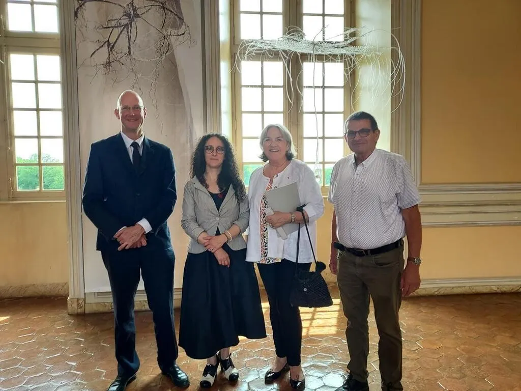 Hervé Yannou, administrateur du château, Marjolaine (l’artiste), Valérie Alain (conseillère départementale), et Pierre Chivard (maire de Carrouges) © Ouest-France