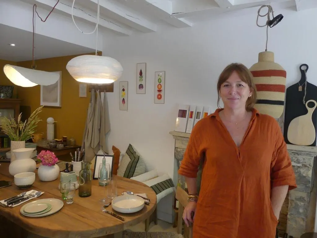Au bout de sa maison, elle a transformé en boutique une pièce donnant sur une terrasse en pavés entourée de glycine. Elle y propose une sélection d’objets de décoration, arts de la table, textile, mobilier et produits d’épicerie fine (vins, huile d’olive, thés et confitures).