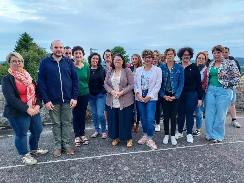 Stéphane Chevron entouré de son équipe avec, à sa droite, Anne Pereira, qui quitte l’école. © Ouest-France