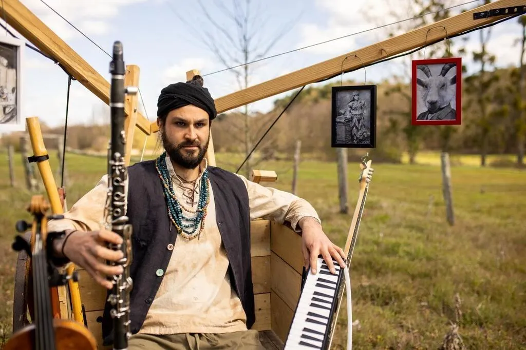 L’homme-orchestre de SolOrkestar au centre de son installation unique pour revisiter la musique traditionnelle de ses ancêtres des Balkans. © Photographyk