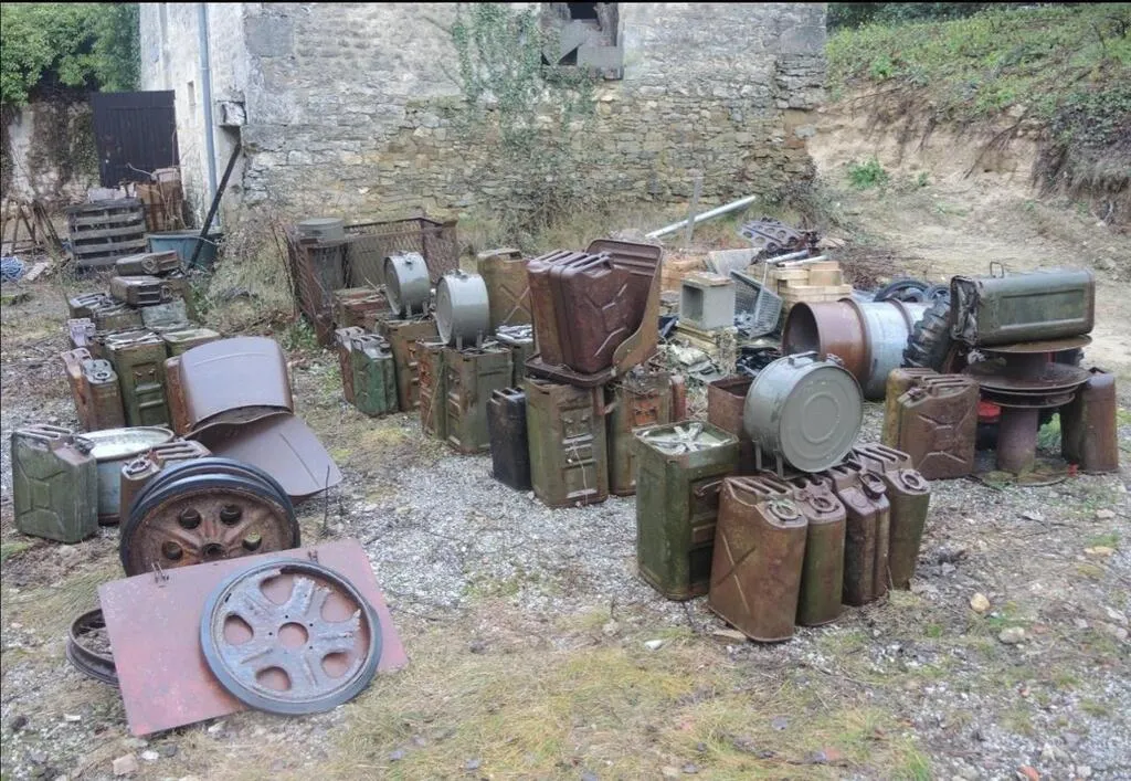 Que trouvera-t-on dans cette vente « à l’ancienne », c’est-à -dire sans possibilité d’enchérir autrement qu’en étant sur place ? De nombreuses caisses, notamment une malle d’officier américain, certes pas en bon état mais nominative ; des jerrycans ; des uniformes de différentes armées (allemande, US, anglaise, française) ; des équipements ; des pièces de véhicules ; un bout d’aile et un réservoir d’avion ; des plaques de blindages ; un chariot hippomobile ; un panier de side-car et « divers accessoires restés dans leur état de découverte et intouchés, au milieu de la poussière et des araignées… », indique le commissaire-priseur Frédéric Nowakowski.