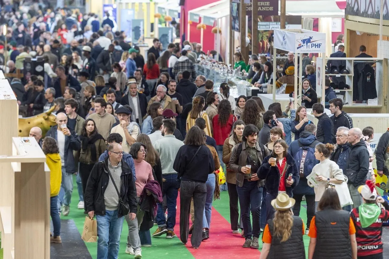Ambiance dans les allées du hall 1 du salon international de l’agriculture malgré l’absence très remarquée des bovins le public est au rendez-vous. © Mathieu Pattier / Ouest-France