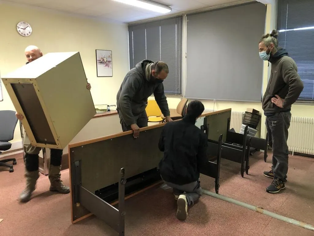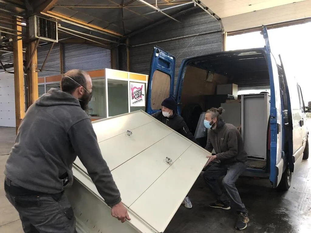 Ce matin, Joachim Parent, encadrant technique, organise ses équipes. Il a mobilisé douze salariés en insertion des Jardins du Cœur de Cuissai. Un groupe vide la cuisine, un autre, les bureaux. Petit à petit, fauteuils, tables, armoires s’amoncellent dans l’entrepôt. Autour d’un utilitaire que Timothée Mestre, le comptable des Restos, vient de garer, le chargement se profile. « Tout doit être retiré ce soir », annonce la présidente départementale, Catherine Weber de Rize.