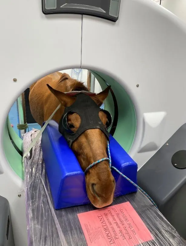 Un yearling passe un scanner, avant d’être opéré pour un retrait de kyste sur le paturon (entre le boulet et la couronne). © Ouest-France
