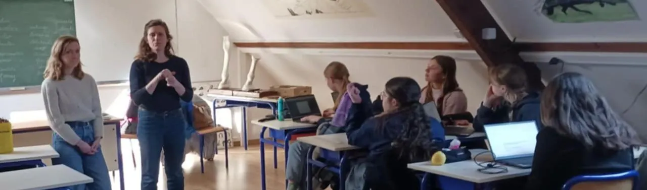 L’autrice Séraphine Menu, et la directrice du Labo des histoires Normandie, Pierrette Pape, sont intervenues à la MFR. © Ouest-France