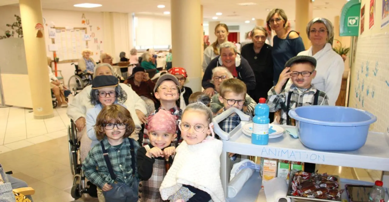 Les élèves de la classe des moyens et grands de l’école maternelle Notre-Dame, de l’enseignante Cécile Aguinet, étaient en visite. Et pour cela, ils s’étaient mis sur leur trente et un. Enfin, disons que pour coller au thème de la Semaine bleue, dédiée à Vieillir, une force à partager, les enfants ont endossé des habits de papis et de mamies.  Les parents ont bien joué le jeu et je les en remercie »,