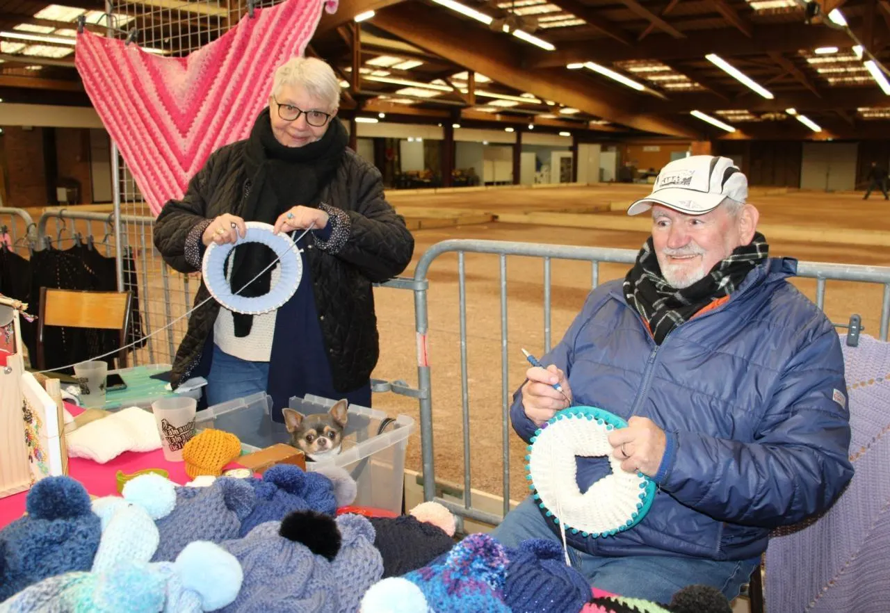 Derrière ce stand proposant toutes sortes de bonnets en laine, tours de cou, châles, de l’enfant à l’adulte, on découvre Chantal et Jean-Claude Savary. Ils viennent de la ville calvadosienne voisine de Livarot. Entre les deux, leur fidèle chihuahua, Optimus, est installé confortablement dans son bac. Chacun s’affaire avec son tricotin. Voir un homme s’adonner à ce type d’activité reste exceptionnel. Mais, Jean-Claude assume et non, ce n’est pas Chantal qui l’y a contraint.