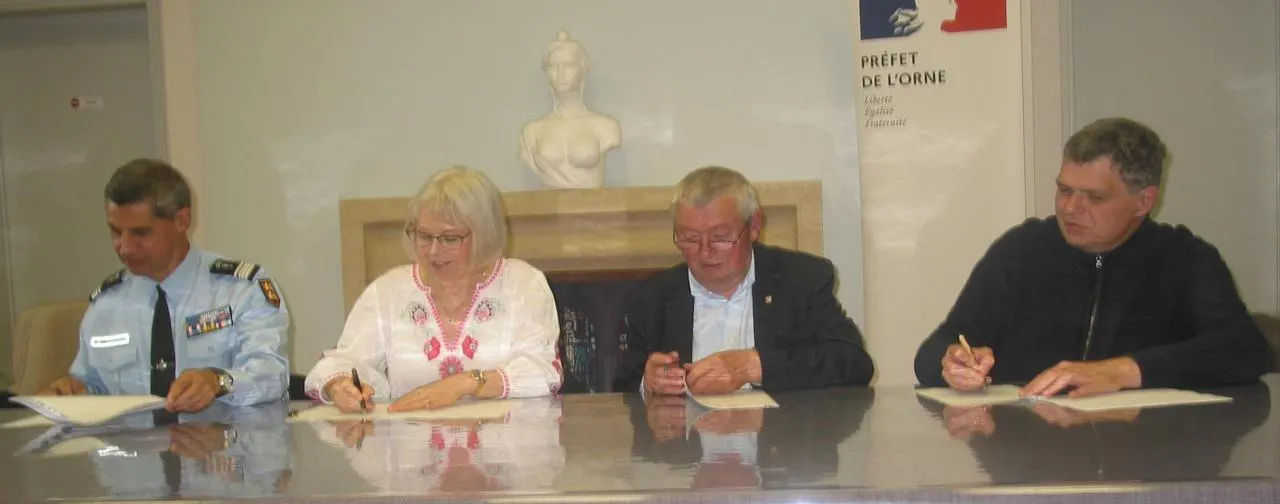 Signatures par le chef d’escadron, commandant Richard Abdelhadi, la sous-préfète d’Argentan, Isabelle Rioux, le maire de Vimoutiers, Guy Romain, le président de la CDC, Sébastien Gourdel. © Ouest-France