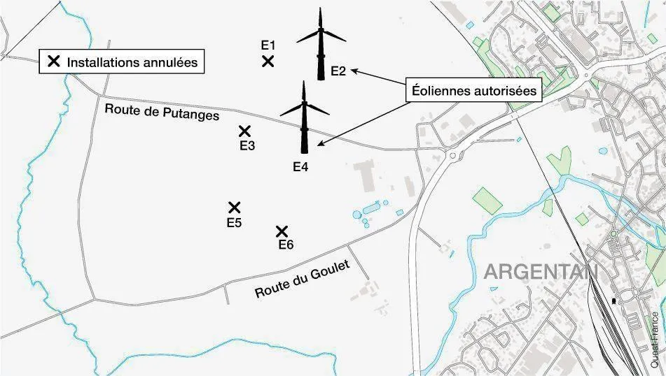 Fin 2024, la société Innovent a obtenu un permis pour ériger deux éoliennes de 73 m à la sortie d’Argentan (Orne), le long de la route de Putanges. Elle espère leur mise en service à la fin de 2025, vingt ans après le dépôt du projet du parc éolien. Plus de mât en bois comme il avait été question par le passé, mais l’hypothèse d’éoliennes d’occasion fait son chemin.