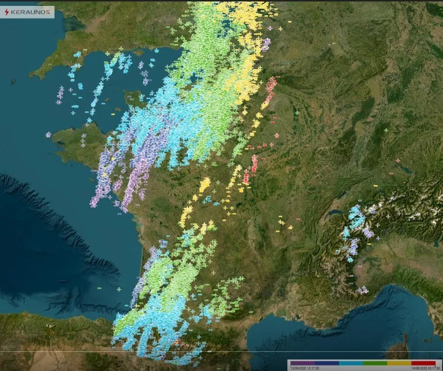 L’activité électrique nuage-sol a été intense vendredi 13 juin 2025. Capture d’écran Keraunos