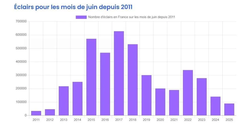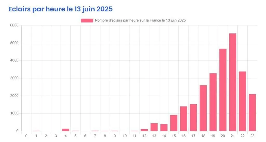 Qu’est-ce que ça a claqué dans le ciel au-dessus de l’Eure vendredi 13 juin 2025 ! Ce département de Normandie, placé en vigilance orange pour les orages comme les quatre autres départements, a été touché par 4 297 éclairs. Il totalise le plus grand nombre d’impacts de foudre.