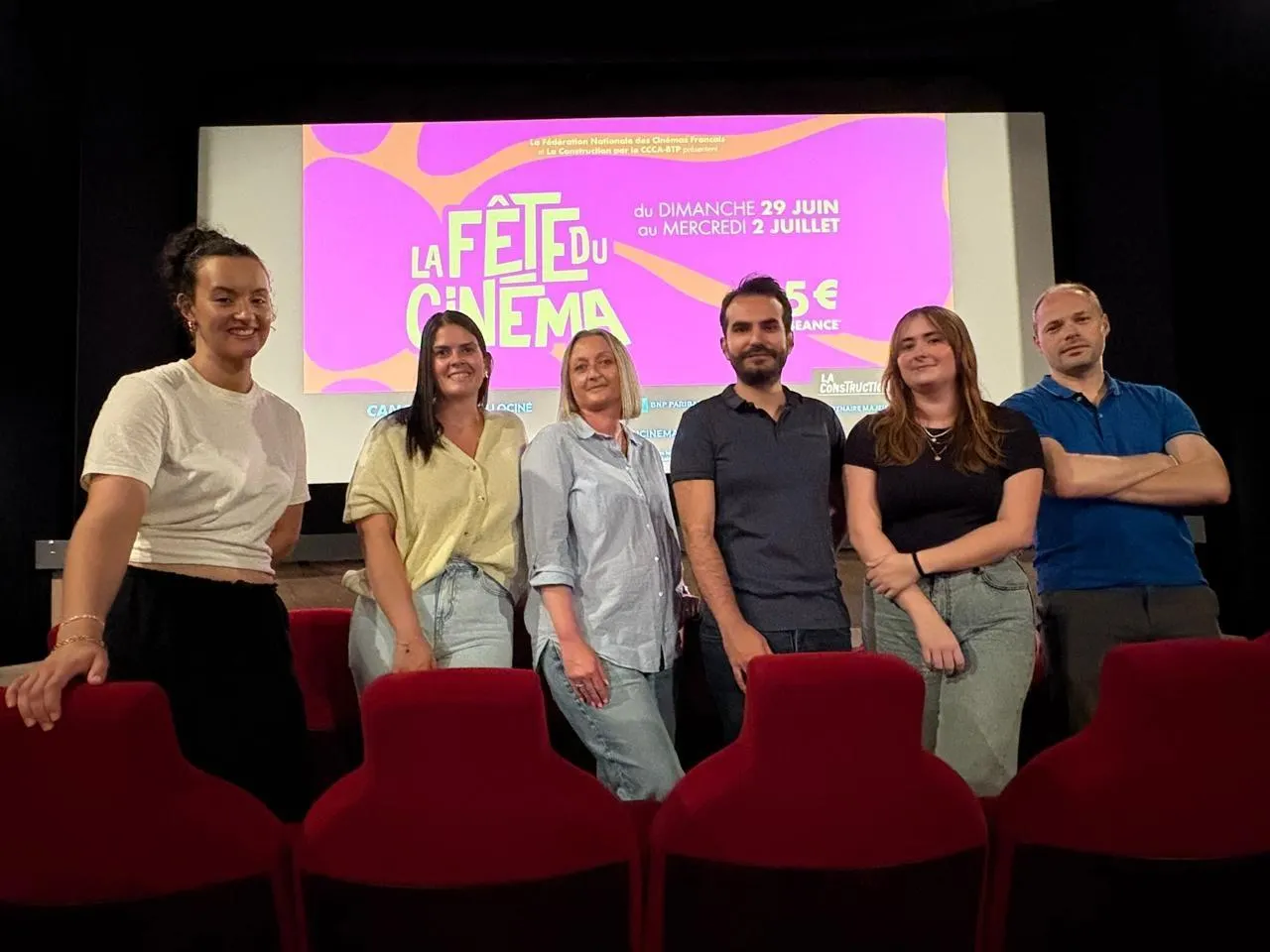 L’équipe du cinéma Morny à Deauville, de gauche à droite : Maya Brunet (alternante communication), Louise Aubry (responsable de site), Sandy Lemarchand (responsable adjointe), Julien Dupuid (technicien), Manon Leroux (alternante en communication) et Rémy Vannoni (technicien chef). © Cinéma Morny