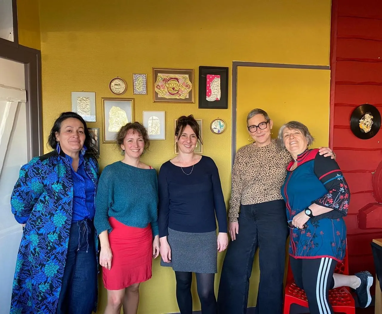 De gauche à droite : Maria Pierre, dont les œuvres trônent derrière, Manon Poudoulec, Jenny Darrot, Gaëlle Leroux, Caroline Crozat. © Ouest-France