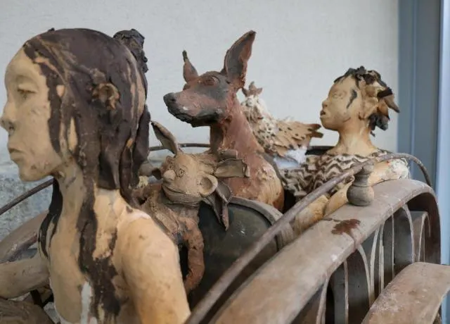 Poules, cochons, chiens, chevaux… Le bestiaire de la sculptrice est désarmant de réalisme. « Je les travaille comme les humains, confie Fanny Ferré. Ils sont plein de défauts anatomiques. L’important pour moi, c’est de sentir qu’ils existent. » Le porteur, le bouc attelé, la fille à la charrette, le pèlerin, la femme au vent, le jeune couple, le portrait de famille… Tous semblent vivants.