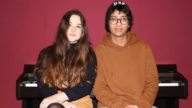 Jayde et Martin, batteur, dans la salle de musique de la Cité U Lébisey, à Caen, où la jeune chanteuse enregistre ses reprises. © OUEST-FRANCE