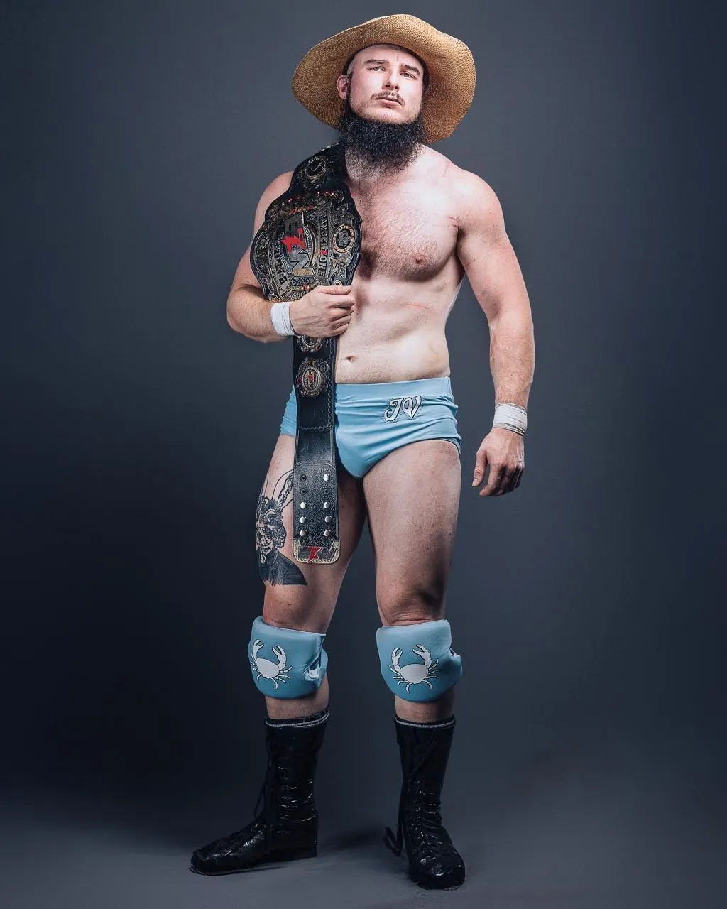 Théo Edoin, est champion de catch de la Banger Zone Wrestling depuis peu. Il joue pleinement la carte de son personnage Jacob Vadocq, un fermier aux accents amish. © GD Photography