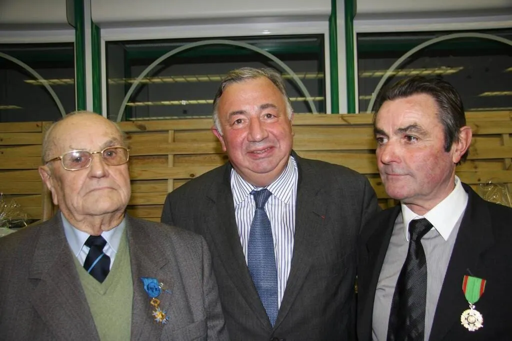 Gérard Larcher (au centre) a remis l’ordre national du Mérite à Albert Rayon (à gauche) et l’ordre du Mérite agricole à Jean-Yves Rayon. Archives Ouest-France