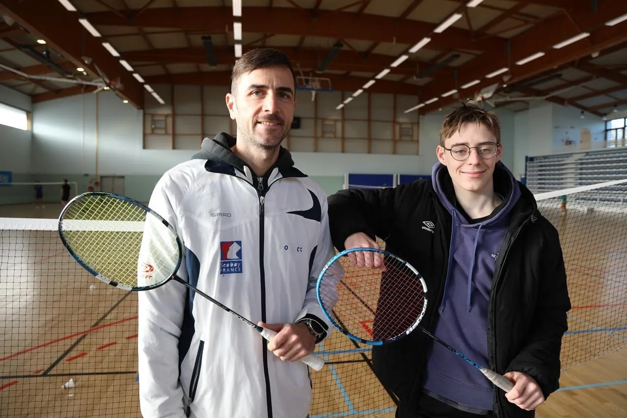 Guillaume Touchard, entraîneur au BOCC depuis 2014, et Baptiste Prima, lycéen à Saint-Joseph, engagé dans un cycle d’encadrement des jeunes badistes. © Ouest-France